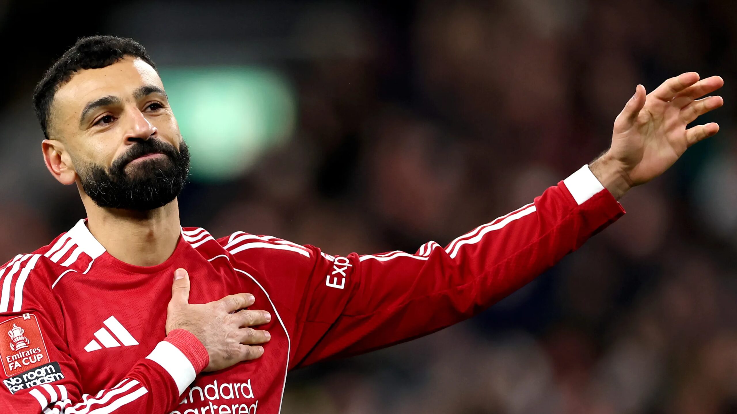 ورد النجم المصري بالتصفيق، ورفع ذراعه اليسرى تحية للدعم الصاخب، قبل أن يصافح مدربه أرني سلوت.