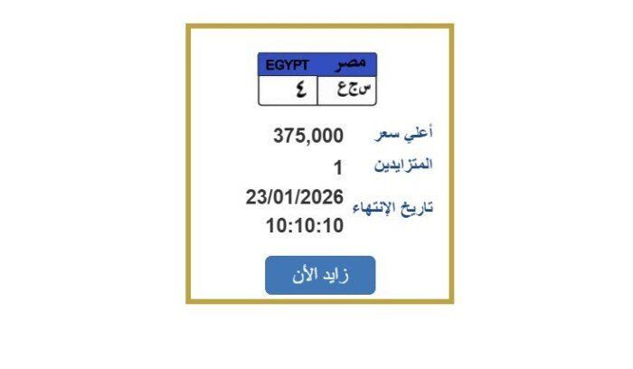 أعلنت بوابة مرور مصر الإلكترونية، المزايدة على لوحة معدنية مميزة للسيارات، وصل سعرها إلى 375 ألف جنيه، وتحمل رقم «س ج ع 4»، ويتزايد عليها حتى الآن شخص واحد، ومن المقرر أن تنتهي المزايدة عليها يوم الجمعة الموافق 23 يناير 2026.