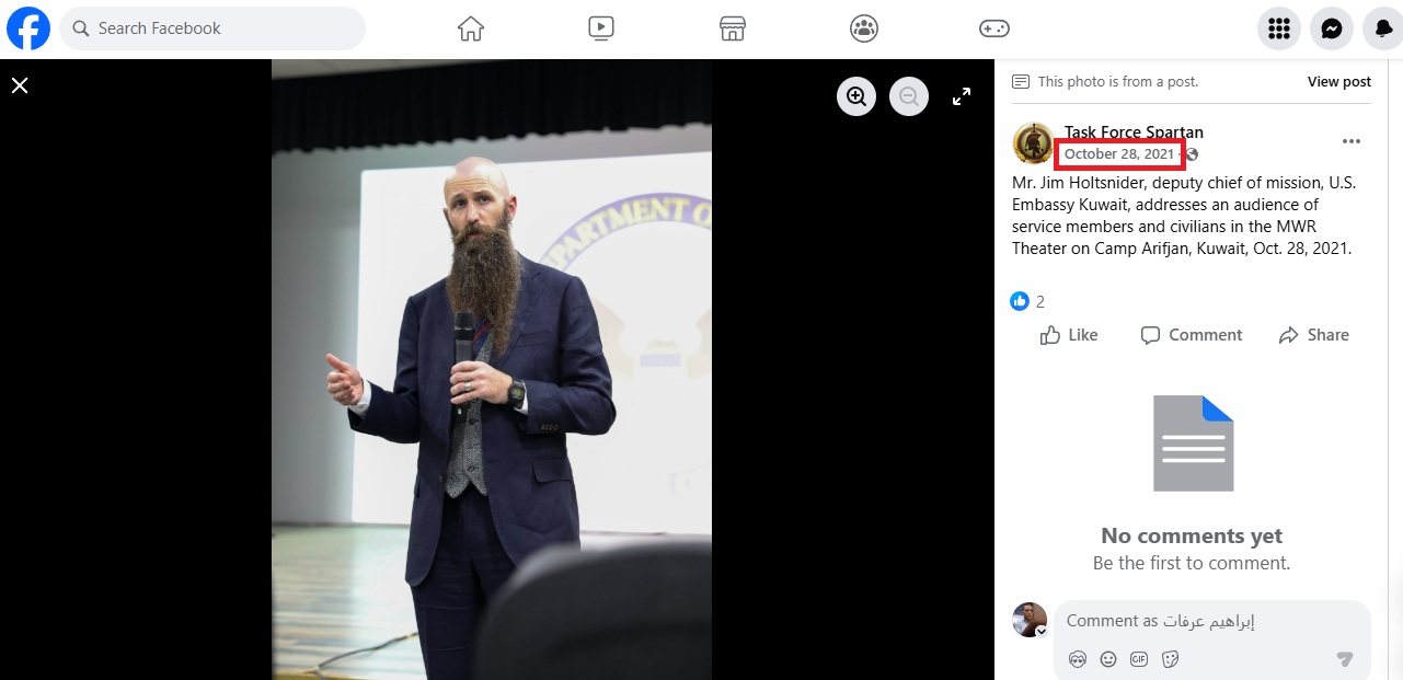 وأوضح التعليق المرفق سياق الصورة، اذ تم التقاطها خلال مخاطبة جيم هولتسنايدر، نائب رئيس البعثة الديبلوماسية في السفارة الاميركية بالكويت آنذاك، عسكريين ومدنيين في مسرح مركز الترفيه والرفاهية (MWR) داخل معسكر عريفجان بالكويت، في 28 تشرين الأول/اكتوبر 2021.