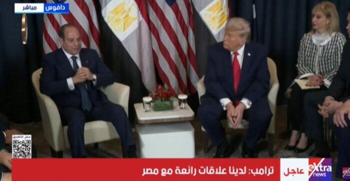 وهنأ الرئيس السيسي خلال اللقاء الثنائي مع نظيره الأمريكي على هامش المنتدى الاقتصادي العالمي، نقلته قناة القاهرة الإخبارية، الرئيس ترامب على عام ناجح من الإنجازات.