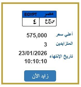 أعلنت بوابة مرور مصر الإلكترونية، المزايدة على لوحة معدنية مميزة للسيارات، وصل سعرها إلى 575 ألف جنيه، وتحمل رقم «س ج ع 4»، ويتزايد عليها حتى الآن 3 أشخاص، ومن المقرر أن تنتهي المزايدة عليها اليوم الجمعة الموافق 23 يناير 2026.